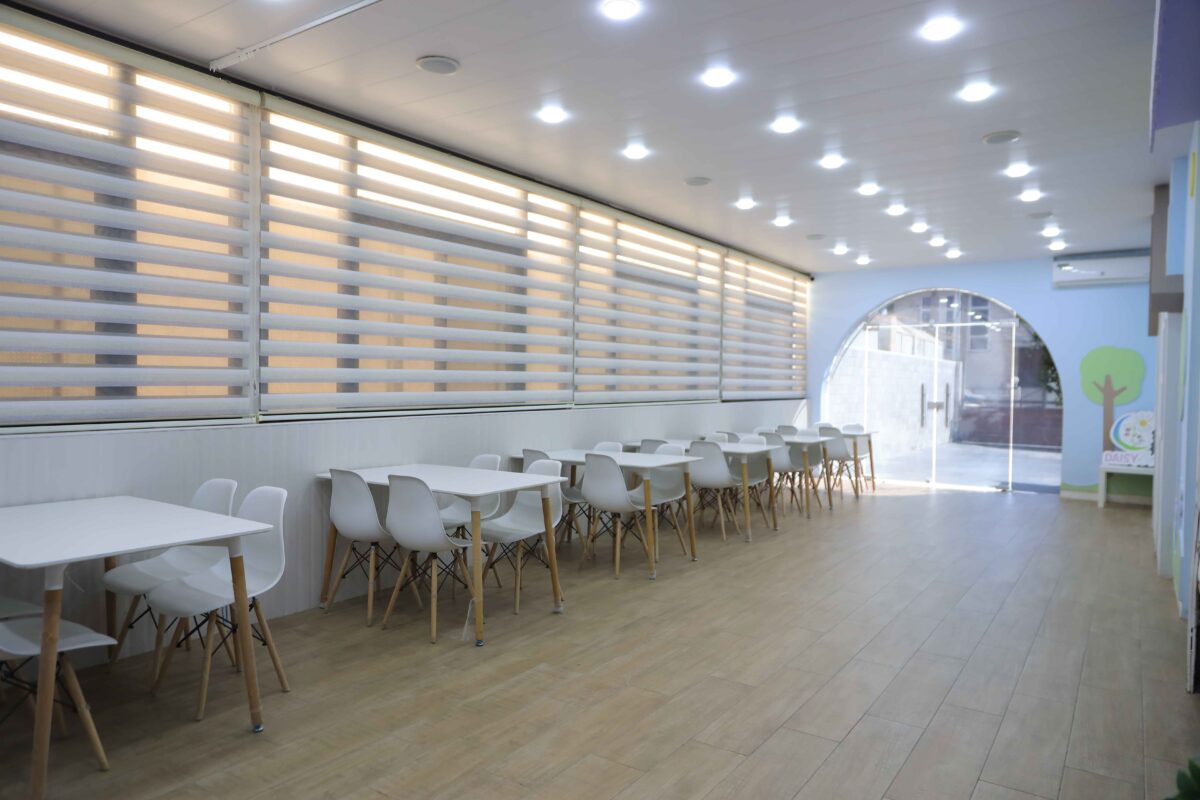 مساحة داخلية دافئة ومرحة ومصممة بشكل جميل في ديزي كيدز، حيث يجتمع الإبداع والتواصل الاجتماعي.